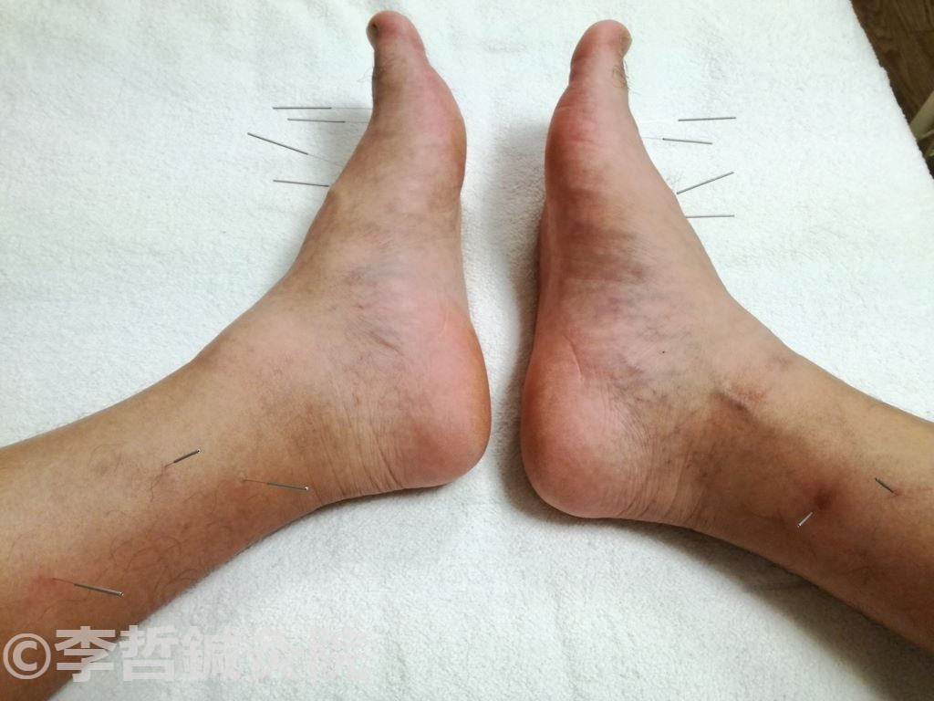 刺したツボは、肝経の太衝穴と行間。胃経の陥谷穴と内廷。あとは、三陰交と築賓。