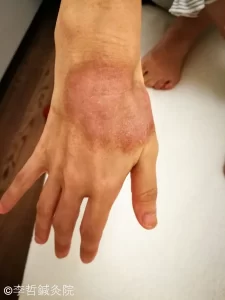 発生した部位は、主に右前腕と右合谷穴あたり。右前腕のは広い範囲で大きな楕円形の湿疹ができて、中から滲出液が出ていました。